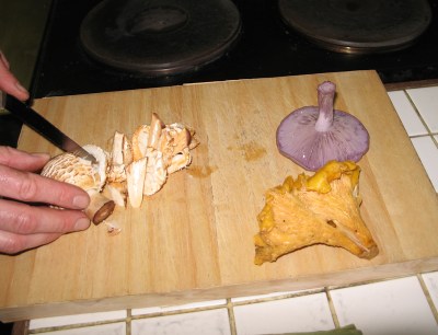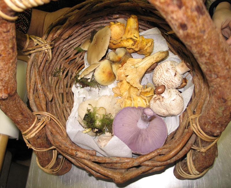 For the first time I stopped at the stall featuring locally foraged fungi. All he had fresh Sunday were saffron milkcaps so I bought several, dinner beginning to form in my head: purple potato gnocchi with wild mushroom cream sauce, purple kale with bacon and onion, offset with gorgeous orange yams. Too bad I didn’t take my own photo cause the mushrooms were this lovely orangey brown, stained green where they had been bruised.