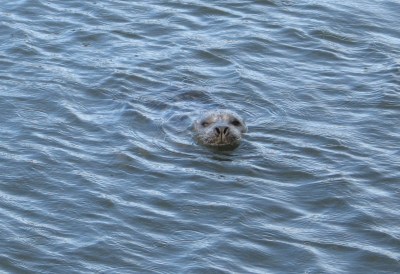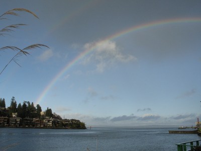 The weather broke in the night and this morning found blue skies and brisk winds. I went out to take a photo of the full rainbow that had formed over the mouth of the ship canal. Standing talking to my neighbor Dan, I glance down and see someone looking up at me from the water, now 4-feet below the dock on my left. It’s a harbor seal! I’ve never seen one so close up – it’s sleek grey head is streaked with dark marks. It’s obsidian eyes stare back at mine, nostrils opening and closing. It’s hard to tell if he is considering me in the way that I am considering him or if he is merely confused from all the turbidity and contaminants polluting his usually pristine home. After nearly a minute, he slips back down into the murk of the storm-stirred brackish water. Normally, this water is almost painfully clear, each pebble eerily outlined when the sweet and salty waters are mixing. But today, when the seal melts back into the water, he is gone.