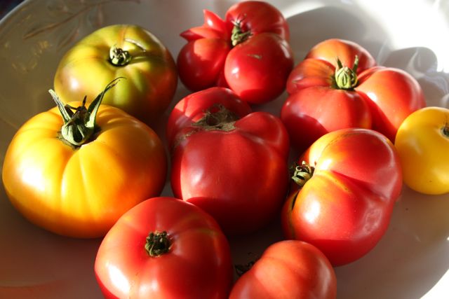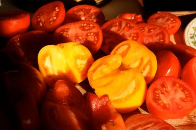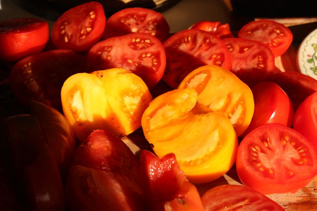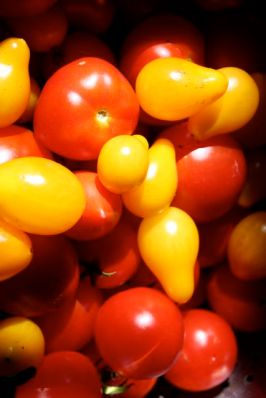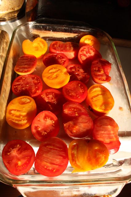 Left with dozens upon dozens of cherry tomatoes (Yellow Pear, Fox), walnut-sized tomatoes (Roma, Stupice), and, OK, a handful or two of gorgeous heirloom brandywine and Orange Queen, what to do? I began of course by making fresh tomato sauce pasta dinners. Yum. But I began drawing fruit flies and we began getting a wee bit tired of the same-old same-old.