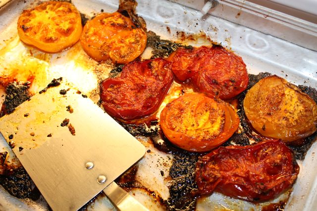 I neglected to take photos of my first attempt in which I ‘roasted’ the tomatoes for 3h at 400F. Don’t do this. They became tragic and comical airy dry, black pucks. I hesitantly popped in my mouth the few slices not too black to recognize as tomato, and they showed the promise and hour or so less oven time would have given. So the pucks went out to the compost, I spent 40 min scraping the charcoal off the roasting pan, and I tried again.