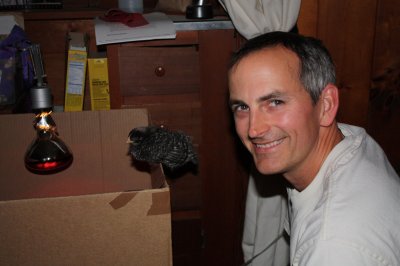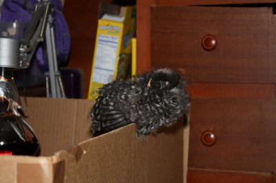 The chickens are 3.5 weeks old, I figure. Their food and water, continually moved up to back height, now sit 4” above the floor. We had to raise the walls of their condo box by taping up the flaps, but even then Rocky has grown tall and strong enough to jump up to the edge. The other night while we watched a movie she jumped up and roosted there, tucking her little head under her wing.