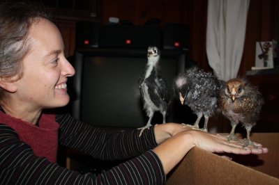 The cat Loca finally became interested in the chicks. Previously, even when we had them out of the box for petting, she couldn’t care less – just lolled on the couch crying for attention as per usual. But last weekend Rocky was perching on the edge of the box, and I was sitting on the couch admiring her when Loca walked in the room. Meowed into the room, for those who know her. Loca hopped onto the couch and headed for my lap. Halfway there she noticed the chicken. I mean, the way a predator does – with her whole body. After I put the chicken back in the box Loca made quite a show of sniffing the edge of the box where Rocky had perched. Not good. Eventually the chickens will be big enough for it to be a fair contest, but ‘til then we’ll have to watch out.