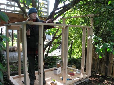 Designing and building this structure is far harder than I imagined. First there were the requirements: 3-6sqft/bird, nest boxes 12x12x14”, roosts no less than 2’ off ground 12” apart and 18” from wall and ceiling, 1sqft light/10sqft of space, etc. Materials? Cost?
