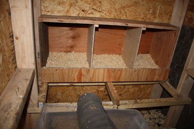 I built the boxes in the garage in November from scrap lumber. Following advice in the wealth of chicken literature, I made them 12″ deep and wide and 14″ tall with a 3″ lip, and I placed them 18″ off the coop floor. I decided to make the boxes easily accessible from the outside by jutting them out and sloping the lid.