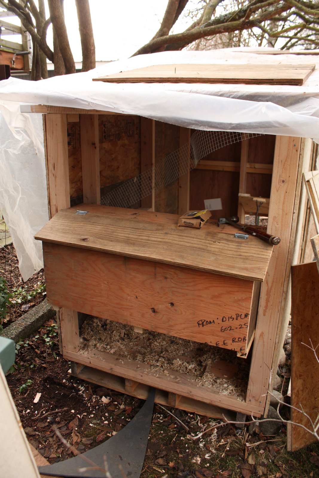 I still have to seal some imperfect joints against drafts, and shingle and paint the box, but I’m pretty happy with the result. Hope the chickens like it too…