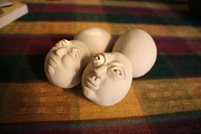 So I took two balls of clay, shaped them into half-spheres, filled them with paper-wrapped little clay balls for fun, and mended them together. This is really fun cause now you have a malleable ball filled with air. After mending the two halves together, I patted the balls with a wooden spatula into an egg shape. When I was sure I was done I made a small hole so air can escape when they fire. After making two eggs I got the idea to put faces on them. This was irresistible and so very fun.