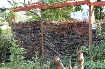In summary, it is a nice fence (visual barrier of the ugliness beyond), it continues to provide a repository for random prunings of shrubs, but does not produce copious amounts of compost. If you’re looking to built a fence and have material to fill it with, build this fence. If you’re looking for a constant supply of compost, build bins.