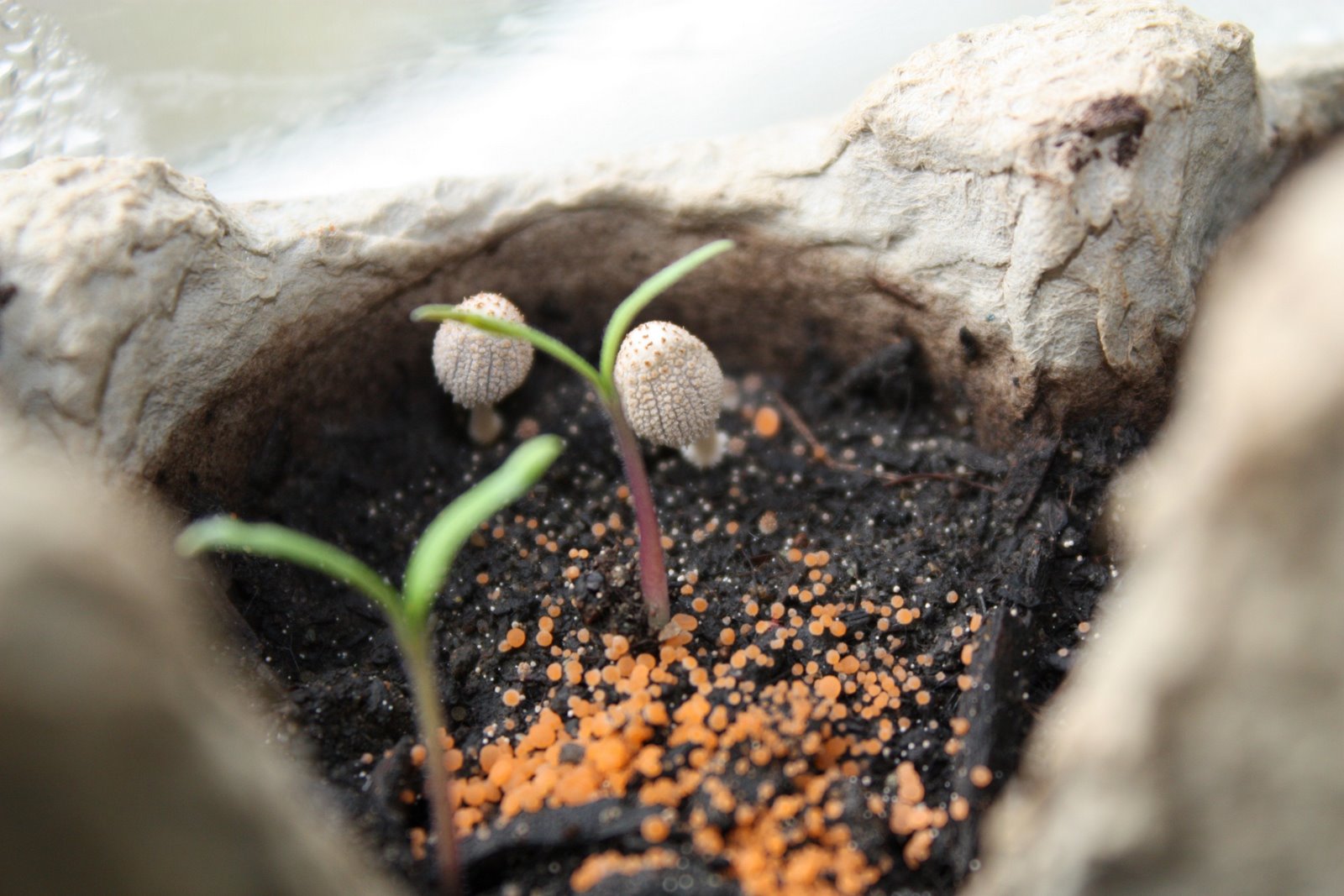 Although enchanted by my tomato plantlets, the coolest result of the germination experiment was the various kinds of fungi speckling the surface of my soil after some very hot humid days under plastic.