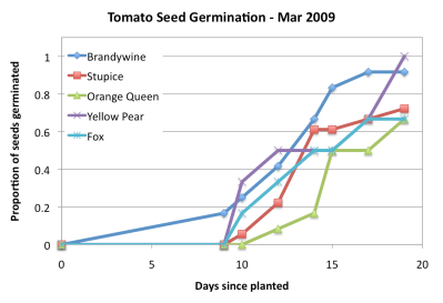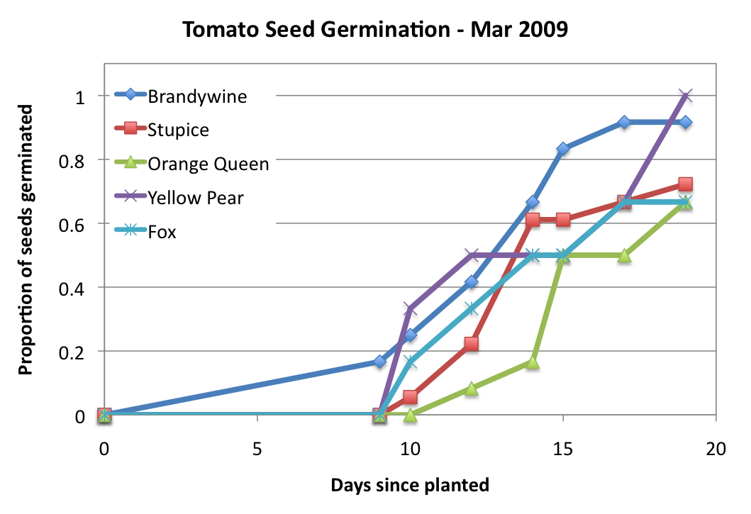 A week later the tomato seeds started germinating and I delight in logging the number of new sprouts to track germination rate. ‘Cause I’m like that.