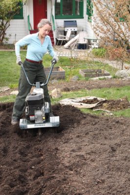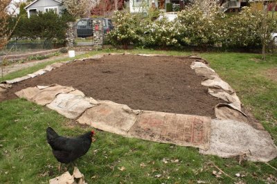 Much to the delight of the chickens, who nabbed every worm and grub I turned up, I started hand digging the partially-decomposed sod. Aie, my aching back! It wasn’t long before I agreed to Scott’s suggestion and borrowed neighbour Matt’s rototiller to finish the job. Hard work even then! I removed the hunks of decomposing sod that would chatter to the surface, and finally had nice, deep soils that were starting to look and feel like ‘garden’.