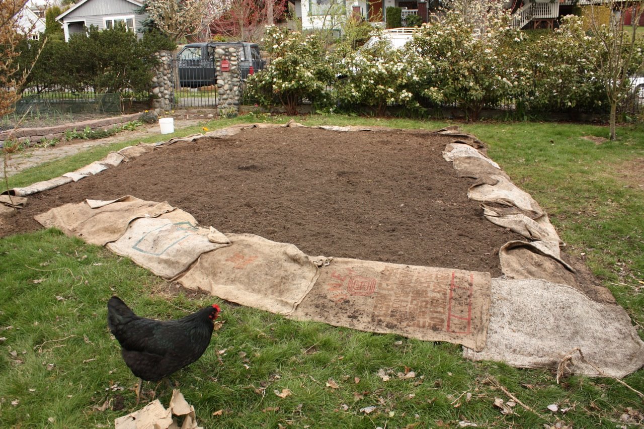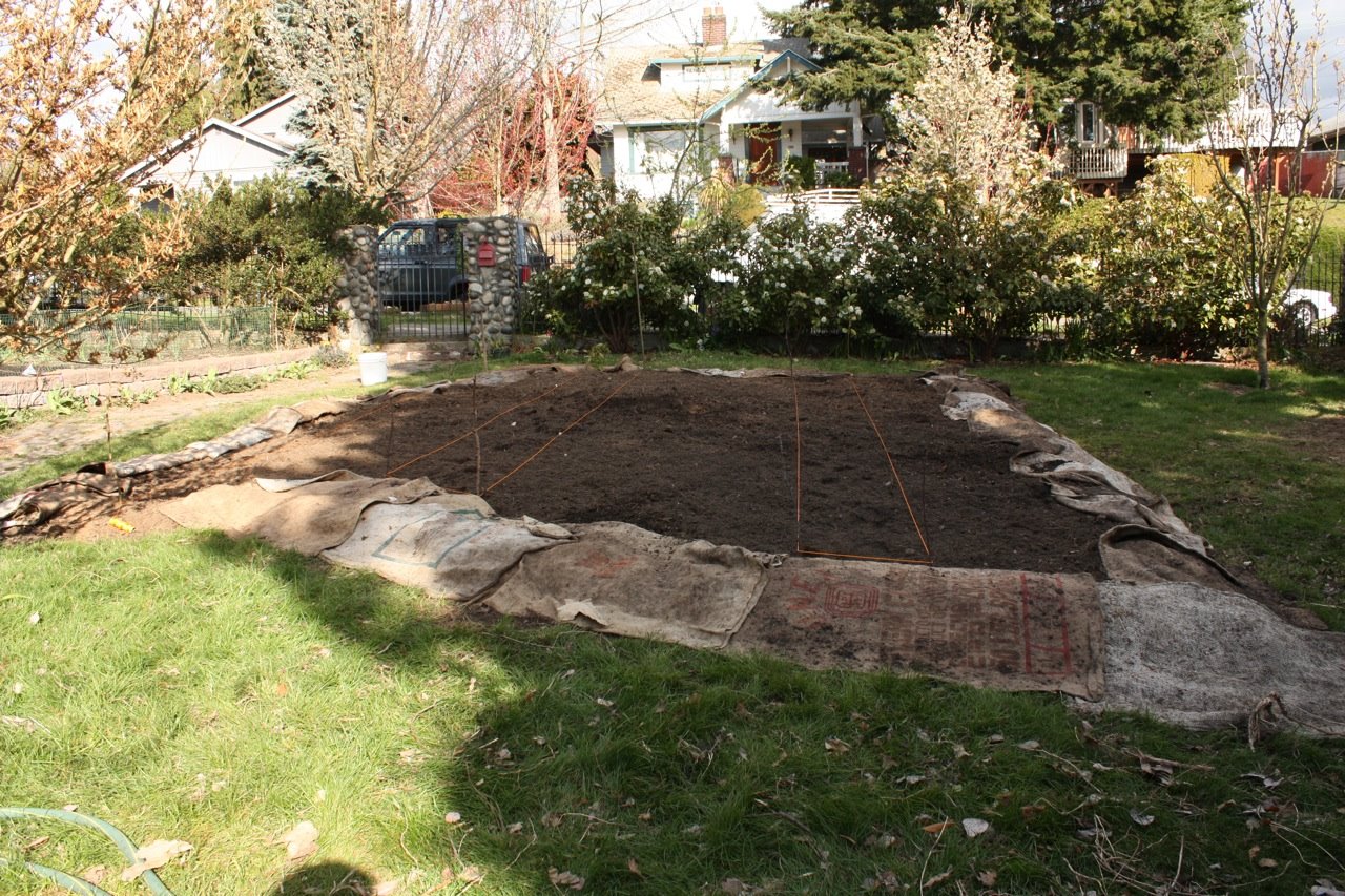 Upon the beautiful grass, I laid cardboard from our moving boxes, and followed that with layers of fall leaves, kitchen scraps, and some enriched soil from my inherited compost pile. Then I ran out of material. I covered the whole area with burlap bags from the local coffee joint, crossed my fingers, and waited until spring. March 1st, I ordered 4 yds of topsoil/compost and spread a good 4” on top of my half-baked version of a lasagna. Now THAT was looking nice! At the beginning of April, I decided it was time to plant.