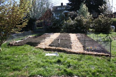 As per Ed’s Bible, I marked out rows 3-4’ wide with 1.5’ wide paths between them. Using guide lines, I dug the footpaths, placing the soil on top of the beds, then raked the beds flat. My garden area slopes south and west, so contouring would have been a good idea. But I laid out the rectangle before considering the incline, so when raking the beds flat I tried to compensate by leveling them somewhat. Finally, I laid down newspaper (4-6 layers) and straw on my footpaths, which hopefully will prevent any remaining sod from regrowing. Voila!