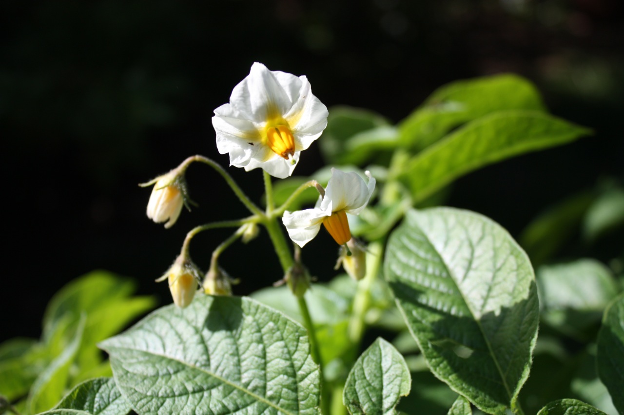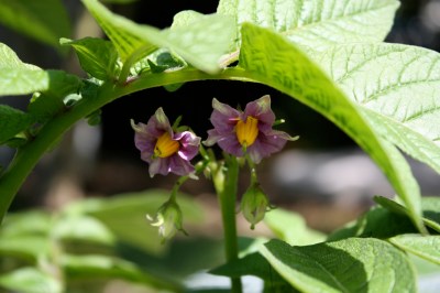 First potato flowers! Plants have topped the 16″ potato boxes and will now make tubers.