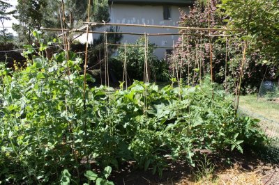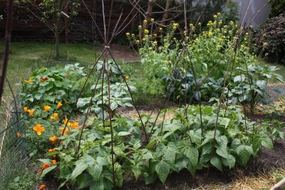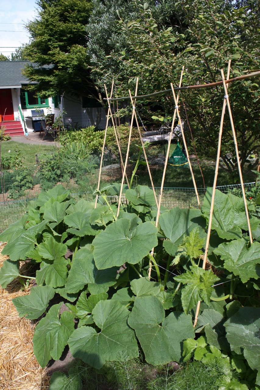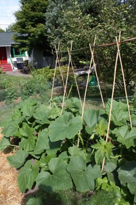 Trellising beans with old twigs – Tiger’s eyes that weren’t supposed to vine! I also have bushy-looking squashes that were supposed to vine and aren’t.