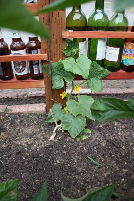 Tomatoes by bottle wall. Flowers on all and first fruit set on Stupice.
