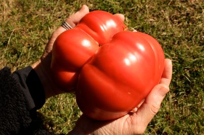 My other tomato: Brandywine heirloom. This year was a bumper tomato crop in the PNW. Lotsa hot days led to enormous tomatoes breaking all my trellises. Quite a few brandywines grew in this double-tomato fashion: