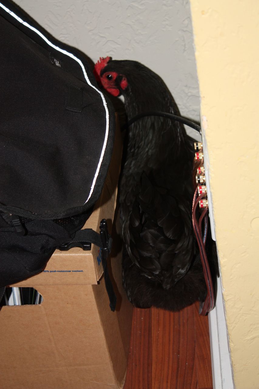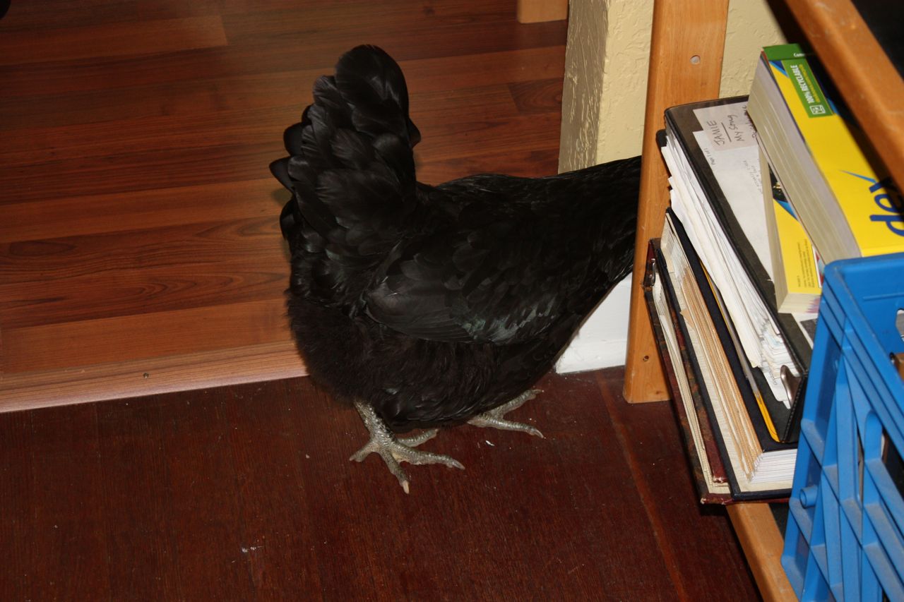 Baracka, the-most-curious-bestest-chicken-in-the-world, was intent on exploring every corner of the house — if we would but turn our backs long enough for her to sneak into the house undetected. While we were in & out of the house putting up storm windows last week, Scott found her in the kitchen eating the cat food.