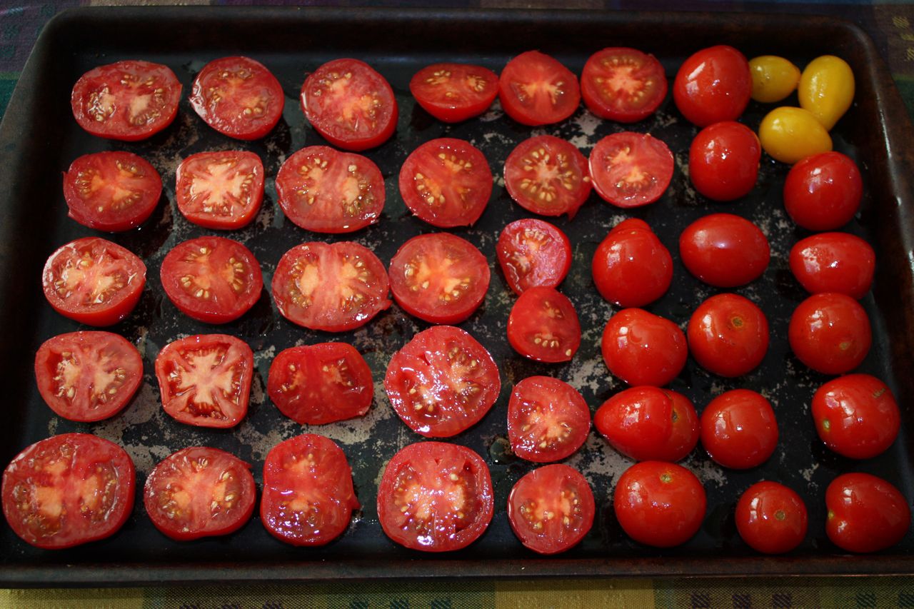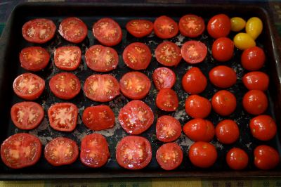 -Crowd tomatoes onto a roasting tray (with lip)