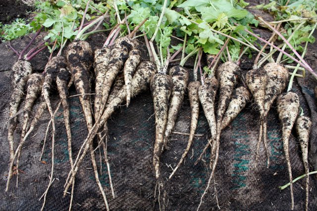 Parnsips pulled from the garden in November are now stacked in damp sawdust in the basement.
