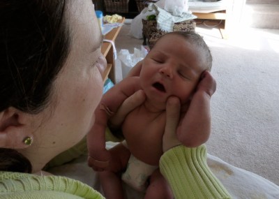 Nearly 4 hours later, the baby was ready to be born. She pushed like a warrior, my little sister. I was so proud of her that I could hardly count – my job during the final labour. After 20 minutes, the baby came out in a whoosh of squirming body, flailing arms, wiggling fingers, blinking eyes, and audible cries. He was here. He was healthy. He was beautiful. And he was big! 8 pounds, 10 ounces. Hairy head, fuzzy back, long fingers and toes, perfect little face. They placed him on her chest and I cried and clapped and laughed as they met for the first time.
