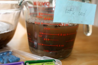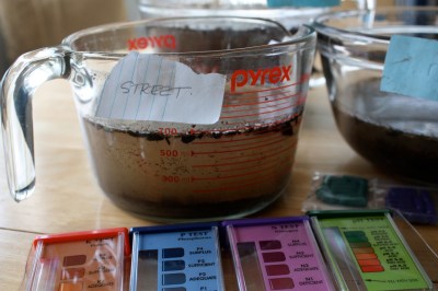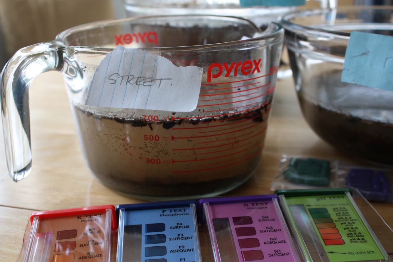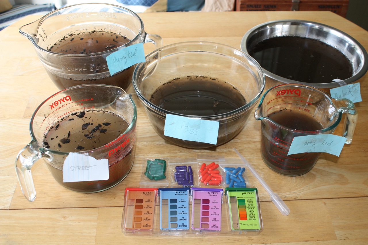 I follow the instructions, taking a mixed sample of soil from a few inches down. I mix in water at 1:5. I wait for the fine particulates to settle.