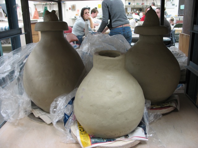 OK, I’m not that good a potter. I had no idea where to start. My teachers recommended I use a groggy sculpture clay and make the walls 1/2″ thick. I started with a flat slab bottom and hand-built the walls using rough coils. My first pots are big, heavy, thick-walled, and I have no idea if they will work.