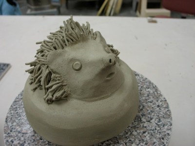 I made lids with funny animal heads, stained them with oxides and underglazes, then covered them with a low-fire clear glaze. I could fire them hot cause the lids don’t need to remain porous, but will just stick with the low-fire for now. I’ll post another pic when they come out of the kiln. [Update: Here they are!]