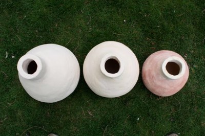 For the first pot I used Akio, a sculpture clay that vitrifies at cone 6. My second and third pots are made from Buff Sculpture Clay from Seattle Pottery Supply. It vitrifies at cone 8-10. That’s really hot. ‘Vitrified’ is the opposite of porous, so I decided not to put my pots through a second firing. Bisqued (cone 06 ~ 1000C) they remain.