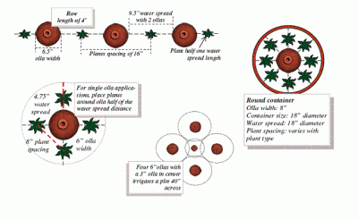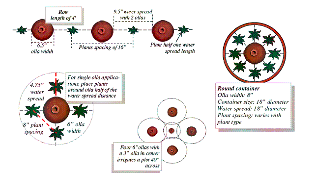 Garden ollas have bulbous bottoms and narrow necks. They are buried up to their neck, filled with water, and capped with something to prevent evaporation. Planting around the pot, within the seep zone, allows plant roots to grow towards the pot, sometimes enveloping it. As the plant roots suck water from the pot, the water level declines and the pot needs to be refilled.