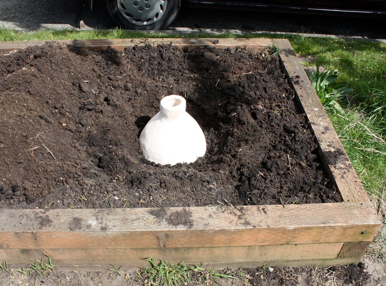 After nearly 2 years of mulling, planning, and anticipation, I planted my homemade ollas this week. I have no idea if they will work – the walls are quite thick compared to the commercial ones I’ve seen online and I don’t know how porous my pots are. Yes, I could have tested this, but I was too impatient! I call it ‘adaptive management’.