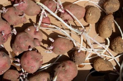 I planted 2 varieties of potatoes from my 2009 harvest: Norketah russets and Red Sangre whites. The Norketah had already produced long shoots in the dresser drawer in the basement, so I’m not sure how that’s going to work out. Will the shoots die? Will the shriveling potatoes bud out again? [Update 5/5/2010: They are growing!] The Red Sangre were mostly still firm with sprouting eyes no more than 1″ long.