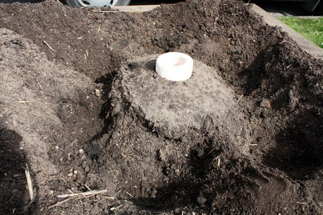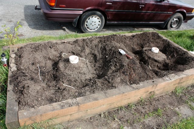 To adapt this for my ollas, I dug a trench around the pot, about 16″ out from center and about 8″ deep so I could plant the seed potato at the midline. I figured the root zone could then maximally envelop the pot. Vemos. I then covered the potatoes with 4″ soil, leaving some pretty big soil mounds in my raised bed with which I can cover the plants as they grow. I figure there will be a circular mound ridge, with the pot mouth in the center.