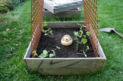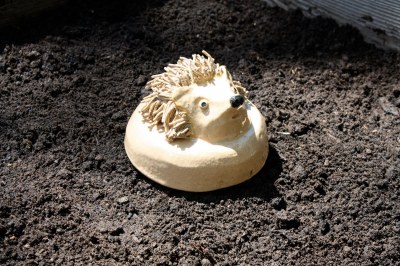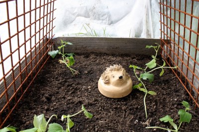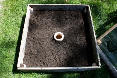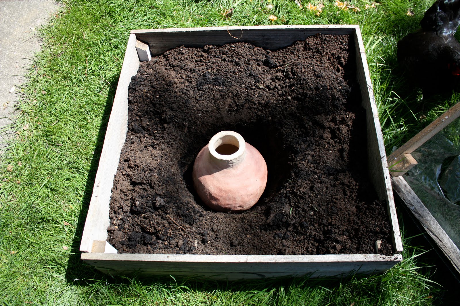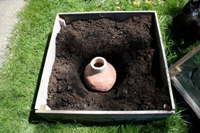 I had one olla ready to plant so I decided to try it with cucumbers in my raised boxes. I dug the olla in to ground-level, patted the soil around it, filled it to the brim, and capped it.