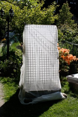 Finally, because it is still cool and because these wee plants are not used to full-strength sunshine, I covered the whole thing in GrowGuard, a floating row cover that lets in rain and holds in heat while softening direct sunlight. This doubles as chicken protection for the time being.