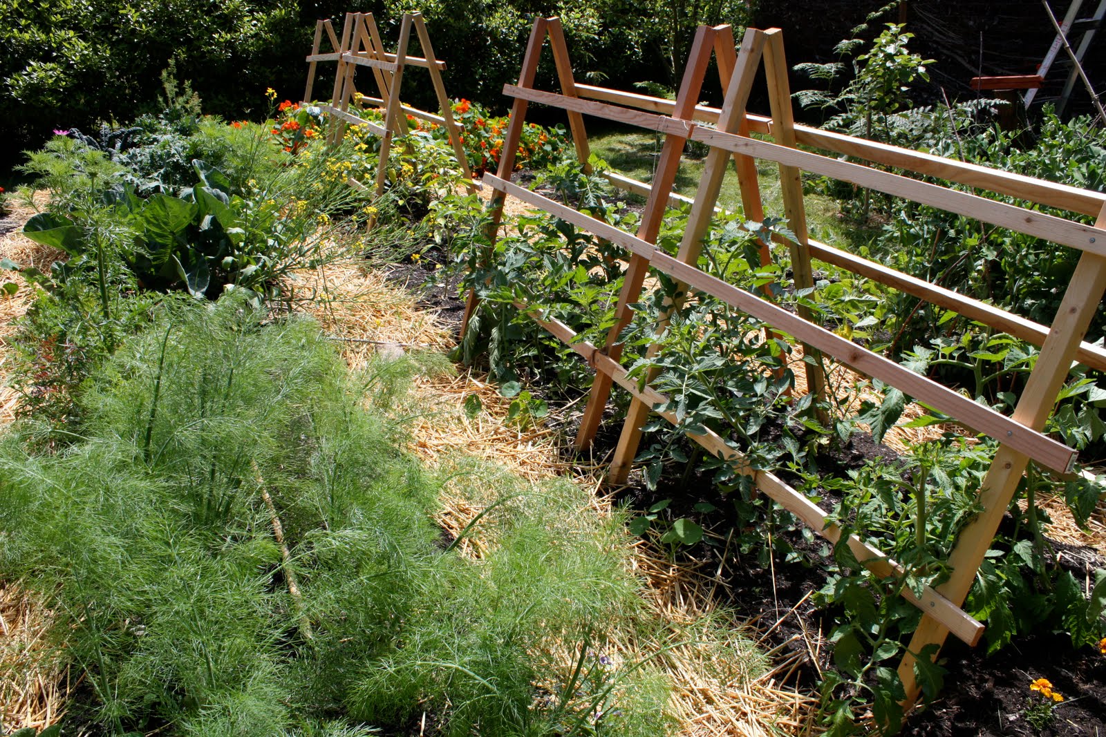 Tomatoes (right) coming along nicely despite the cool weather. Fennel (left) clam-happy.