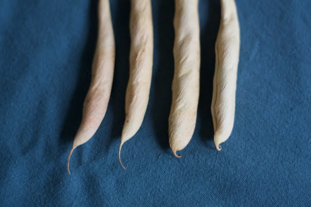 Left on the vine the pods yellow, then dry to a crackly, rattling finish. I pick them as soon as they start to rattle in their tawny pods. I split open the husks and – voila! – jewels inside. (Click on photo for enlarged view)