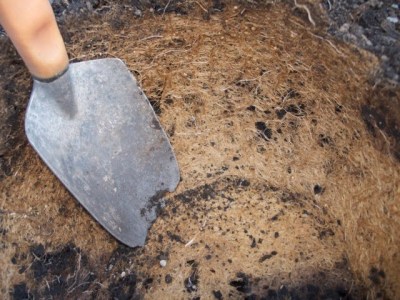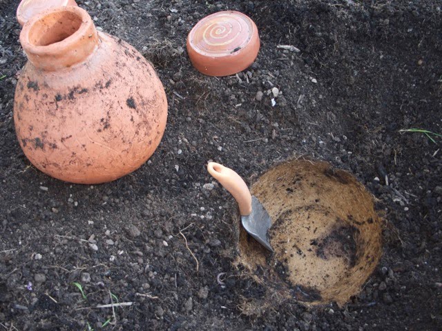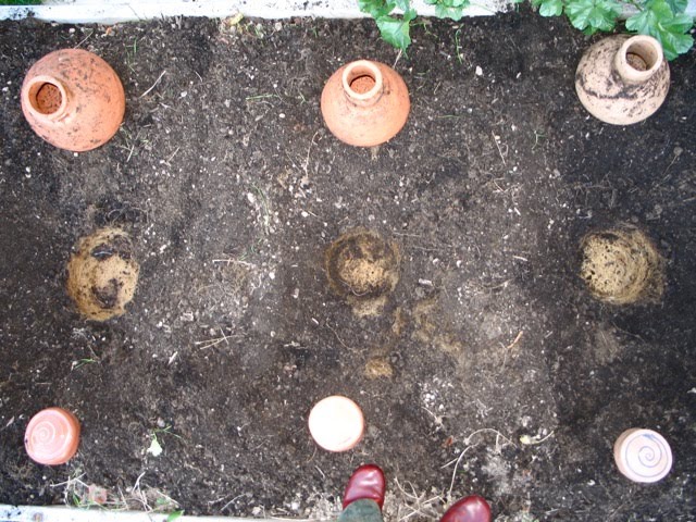 From left to right: RAS (red art with sand), RAS, and brown terracotta ollas adjacent to where they had been planted. You can see the root mat left behind where each olla had been planted.