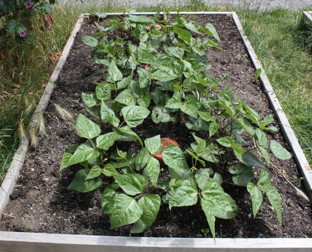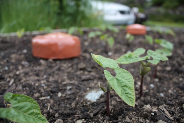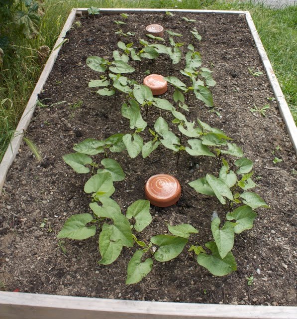 I used ollas for beans in two different beds. One was planted with Royal Burgandy the other with Ventura (green). The beans were planted in succession, starting with the burgandy bed. Finally, olla types varied among the beds; the burgandy bed had two ‘red art with sand’ and one ‘terracotta brown’, the green bed had one ‘terracotta brown’, one ‘red art’, and one ‘sculpture clay’.