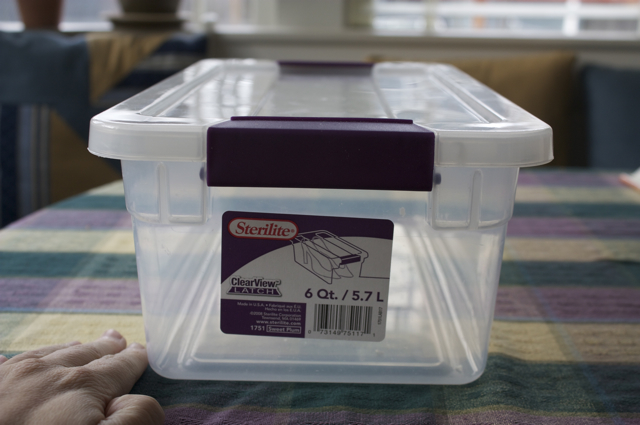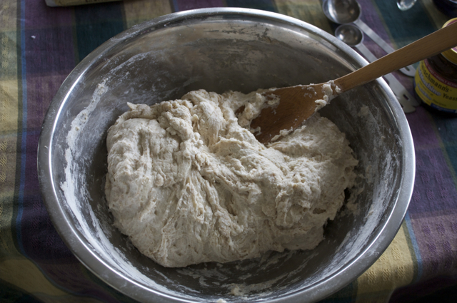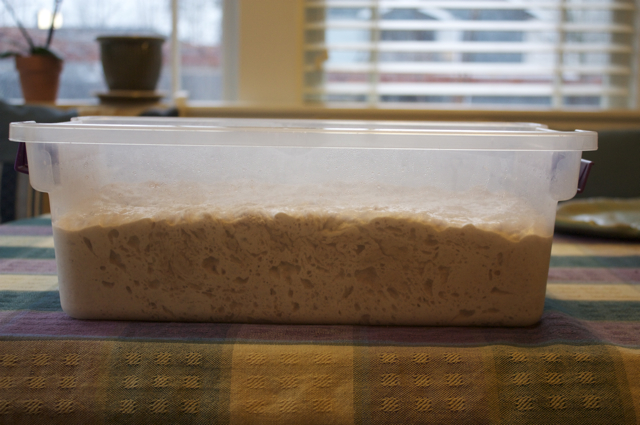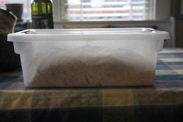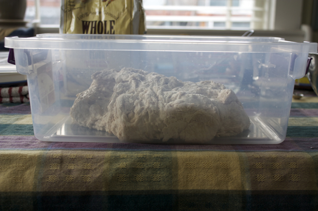 Because my container is obviously ill-suited to mixing, I mix the dough in this round bowl then store it in the plastic one.