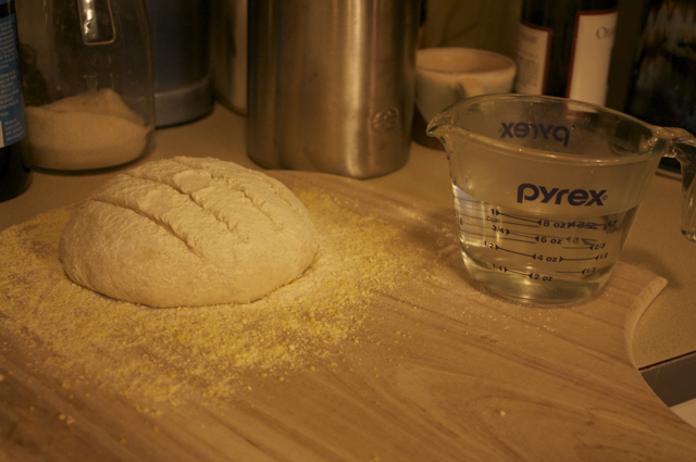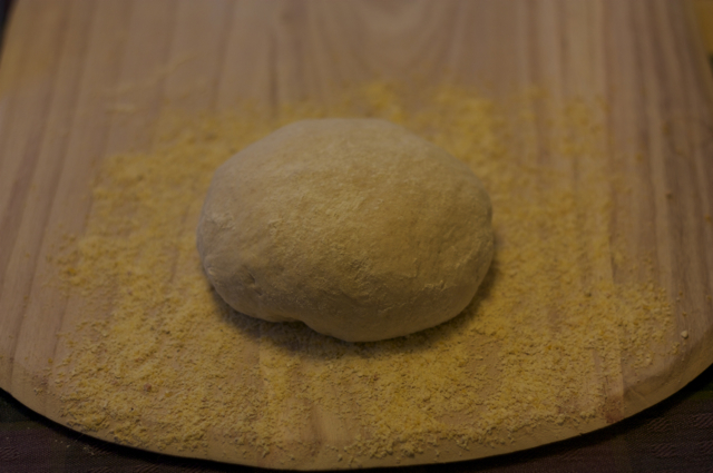 The dough is shaped by stretching the surface tight, collecting the ends under the ‘boule’, in this case. Cornmeal keeps the ball from sticking to the wooden peel.