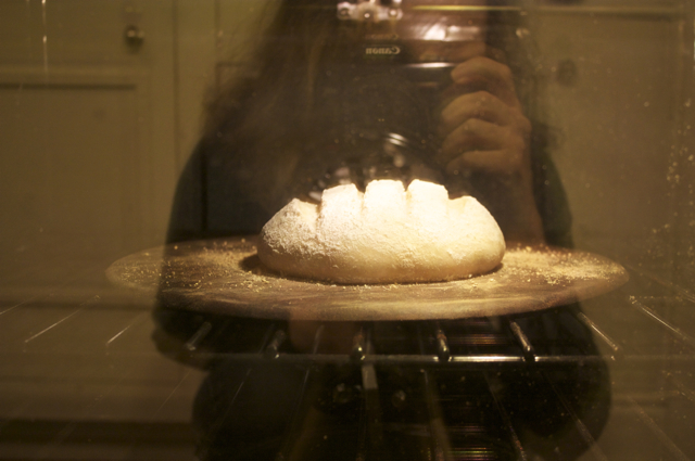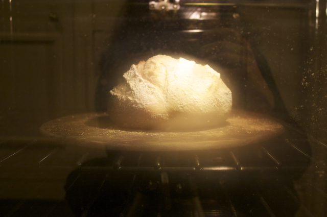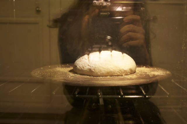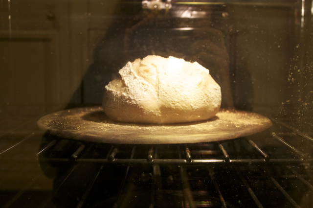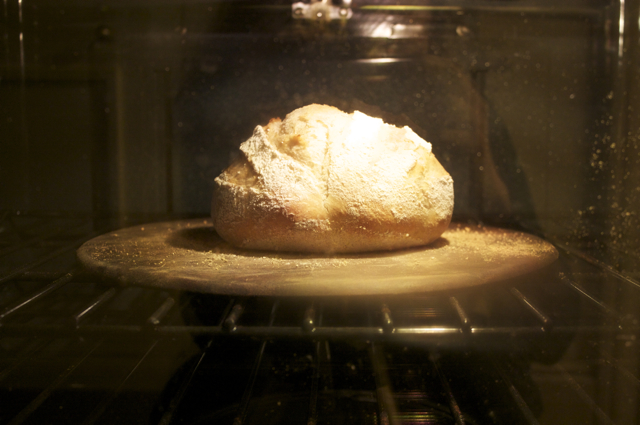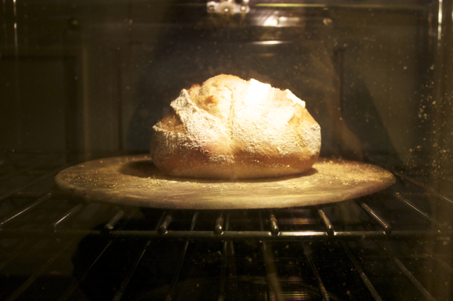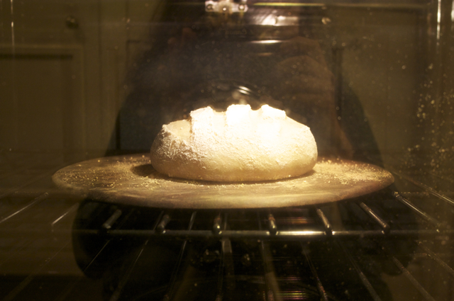 Just prior to baking, dust the surface with flour and cut 1/4″ indentations with a serrated knife. This is an important step allowing the loaf to successfully rise (i.e not explode). As the dough is slid onto the hot baking stone (450F), 1 cup of water is poured into a pan beneath the stone. The steam paradoxically allows the crust to crisp.