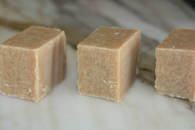 To avoid the caustic-orange of burned sugars, I froze the goat milk in appropriate-sized batches (42 oz for 120 oz of soap) and tried dissolving the lye in a goat milk slush on soap day. The mixture still turned orange, but the final bars are a lovely tan.