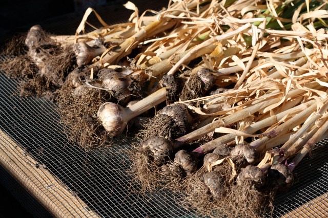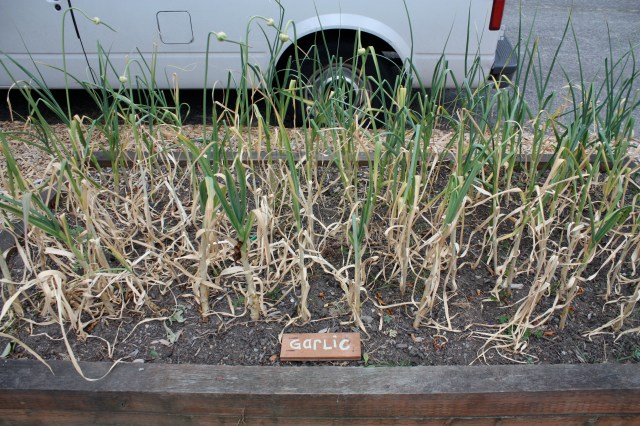 Yesterday I dug up the White Rose garlic. I don’t water the garlic well because it is out by the street, beyond the reach of my hose . Resulta: It has been looking rather pathetic. White Rose looked the worst, so up it came. 34 lovely bulbs drying in the sun. The rest of the crop could look worse, so I left it in the ground.