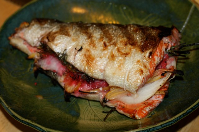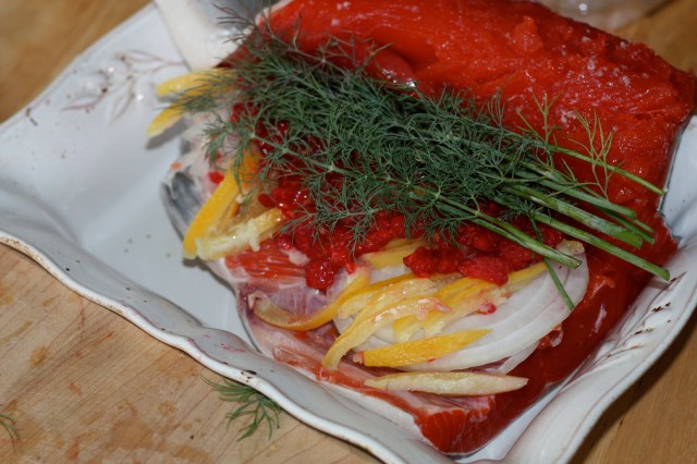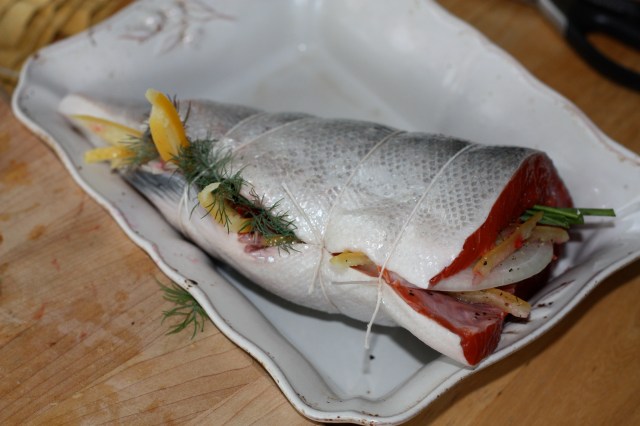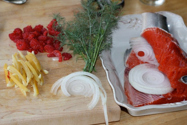 Typically, one would stuff the fish with lemons, at the very least. What I had was homemade preserved lemons. And onions, and fresh raspberries and dill from the garden. I lightly sprinkled the inside of the fish with coarse salt, layered the ingredients, then added a little cracked pepper.