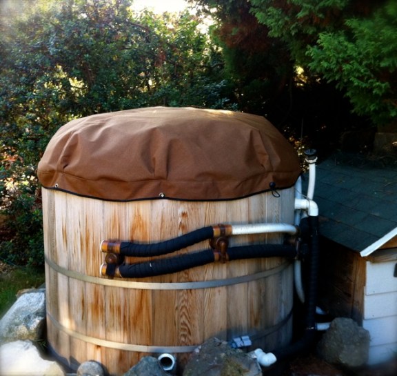 Spa Caps are custom-made in Lynden, WA by real people. Real people you can order from after talking with them on the phone. Seriously. As the Spa Cap website will tell you, they had this great idea to insulate hot tubs with air, instead of foam that tends to saturate and need replacement within 10 years. There are no less than three air baffles in my spa cap. Because the spa cap floats on the water, there is less opportunity for evaporation because heat is not lost to the air layer between the water and the hot tub cover. Nifty.