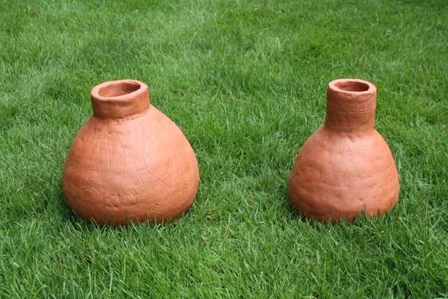 I have made 15 ollas now from 5 clay types, all fired at ‘bisque’ temperatures (cone 06 ~ 1000 degC); Akio, Sculpture Buff, Red Art, Red Art with Sand, Brown Terracotta. The Red Art ollas are beautiful, but became vitreous – they hold water instead of seeping it. The other 4 clay bodies ‘work’ – in that they are porous and water the roots of nearby plants.