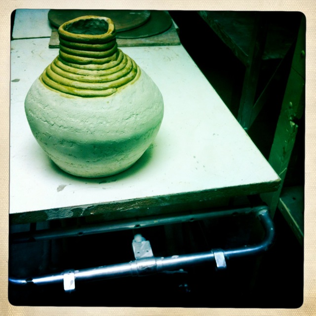Lightest, thinnest olla yet. Green is wax to slow dry the coiled neck