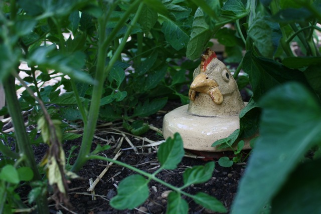 Chicken-lidded olla pokes its beak out through its four tomato plants