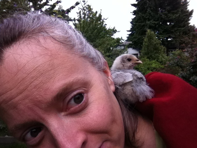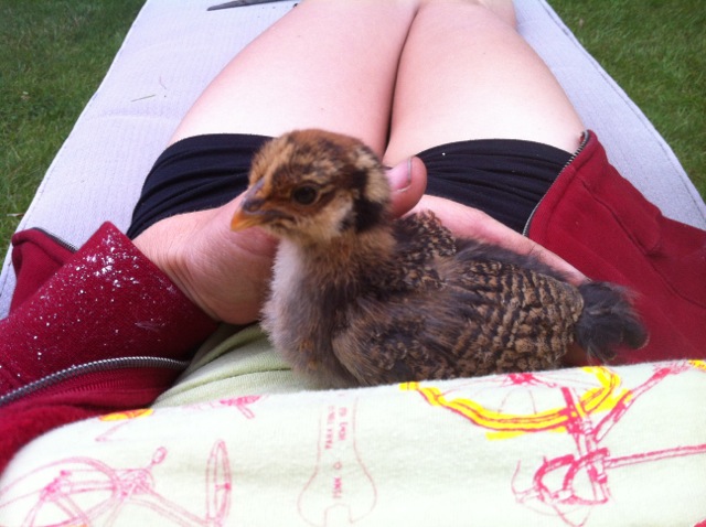 And so we spend time with them, we hold them. We bring them treats and try to get them to eat out of our hand. They are starting to associate us with food (which is the only way to a chicken’s heart). Interestingly, training them on food has been indirect, because they learn about food from Momma. New offerings are ignored until Momma tries it and calls them over, then she gives them the food. I just hope they will start to generalize and accept more directly from us. And, hey, suggestions welcome!