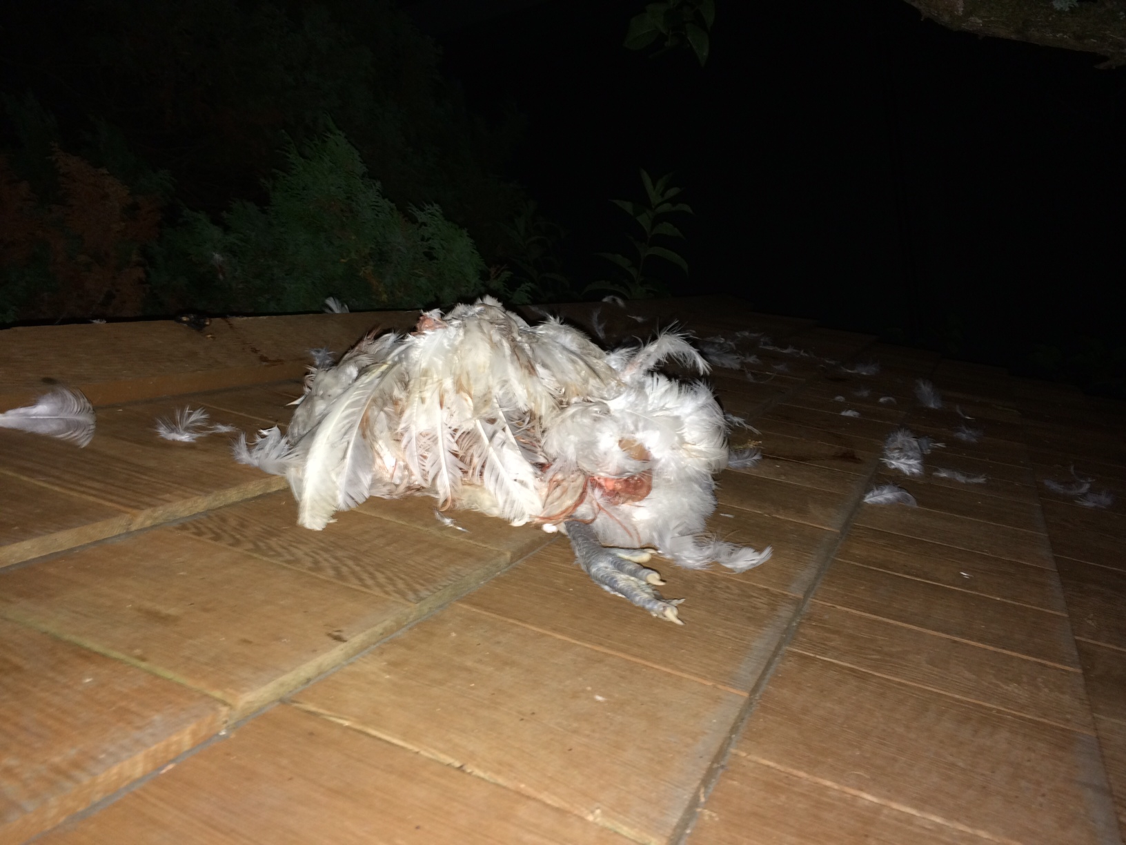 Last night we went to a friend’s house before dark. The chickens weren’t in the coop yet so we left them be. When we got home, I nearly tripped over the little Australorp as I came down the walk. What was she doing out? I found our little Ameraucana perched on the chicken tractor. Scott eventually told me to stop looking. He had spotted the trails of white feathers that led to our androgenous Frankie – now a mangled mess left on top of the shed.